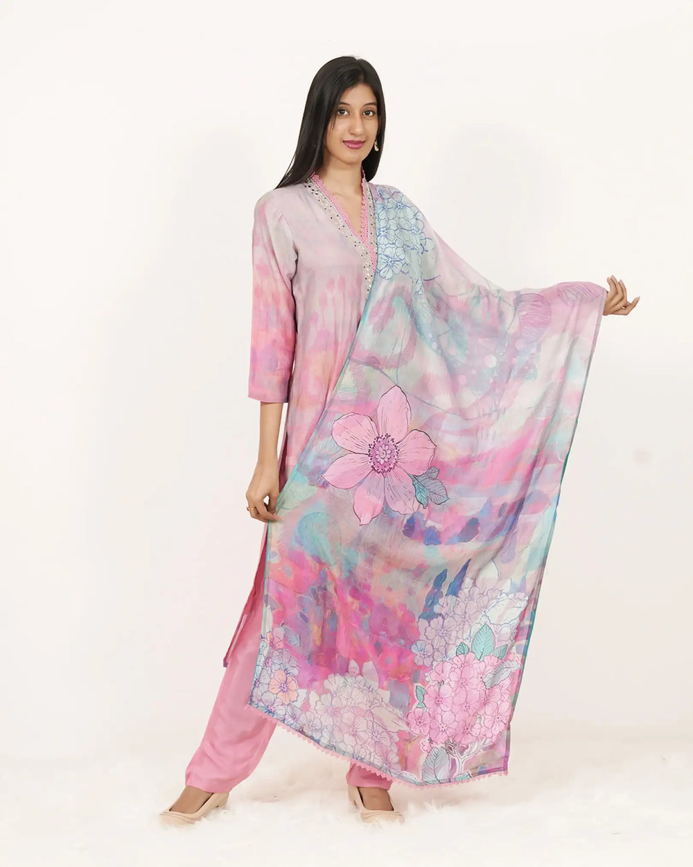 An elegant combination of lilac grey and flamingo pink, this muslin silk salwar set is highlighted with delicate mirror work and pleated detailing. Paired with a soft silk bottom and a floral printed dupatta, it’s perfect for festive and semi-traditional occasions.