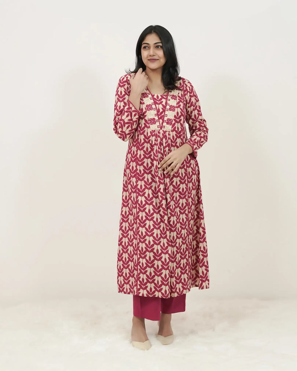 Comfortable beige and dark pink A-line anarkali suit in pure cotton, designed with center pleats and lace-trimmed side panels. Paired with a dark pink straight-fit cotton bottom featuring a functional side pocket, and a printed dark pink cotton dupatta. Styled with a V-neckline and finished with plain, top stitch, and overlock craftsmanship for a chic everyday ethnic look.
