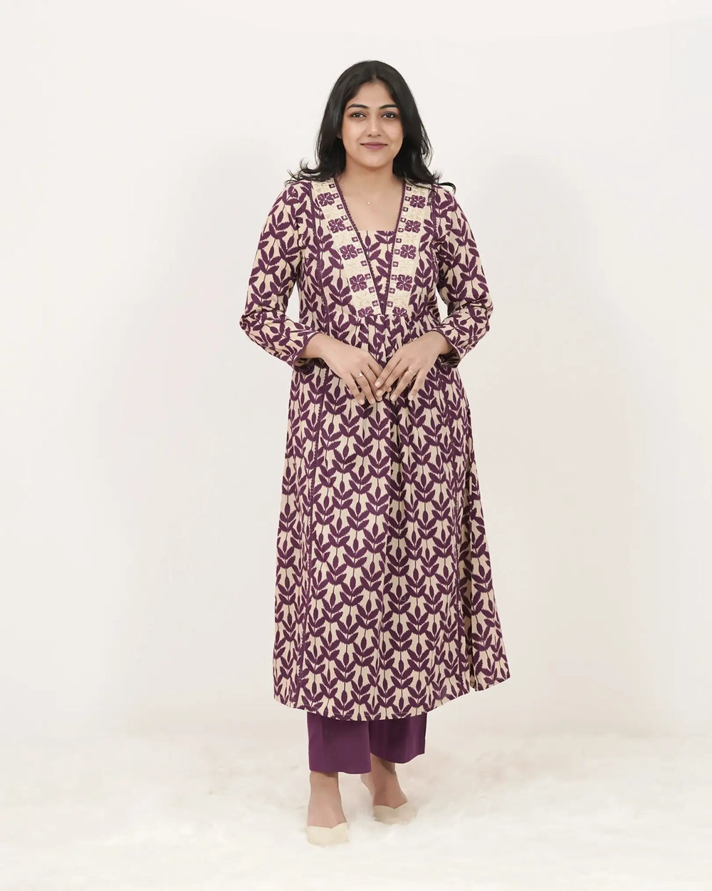 Chic beige and dark purple A-line anarkali suit in pure cotton, designed with center pleats and lace-trimmed side panels. Paired with a dark purple straight-fit cotton bottom featuring a practical side pocket, and a printed dark purple cotton dupatta. Styled with a flattering V-neckline and finished with plain, top stitch, and overlock detailing — perfect for stylish casual wear.