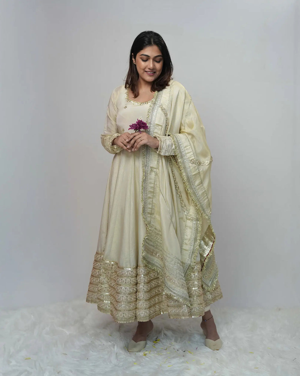 A luxurious three-piece ensemble in elegant off-white. The premium tissue silk anarkali is crafted with heavy volume, detailed lacework on the hem, and gathered sleeve hems adorned with rich fabric tassels. It pairs beautifully with a comfortable cotton normal-fit bottom and a heavy tissue silk dupatta lavishly finished with intricate lacework—ideal for weddings, festive occasions, and grand celebrations.
