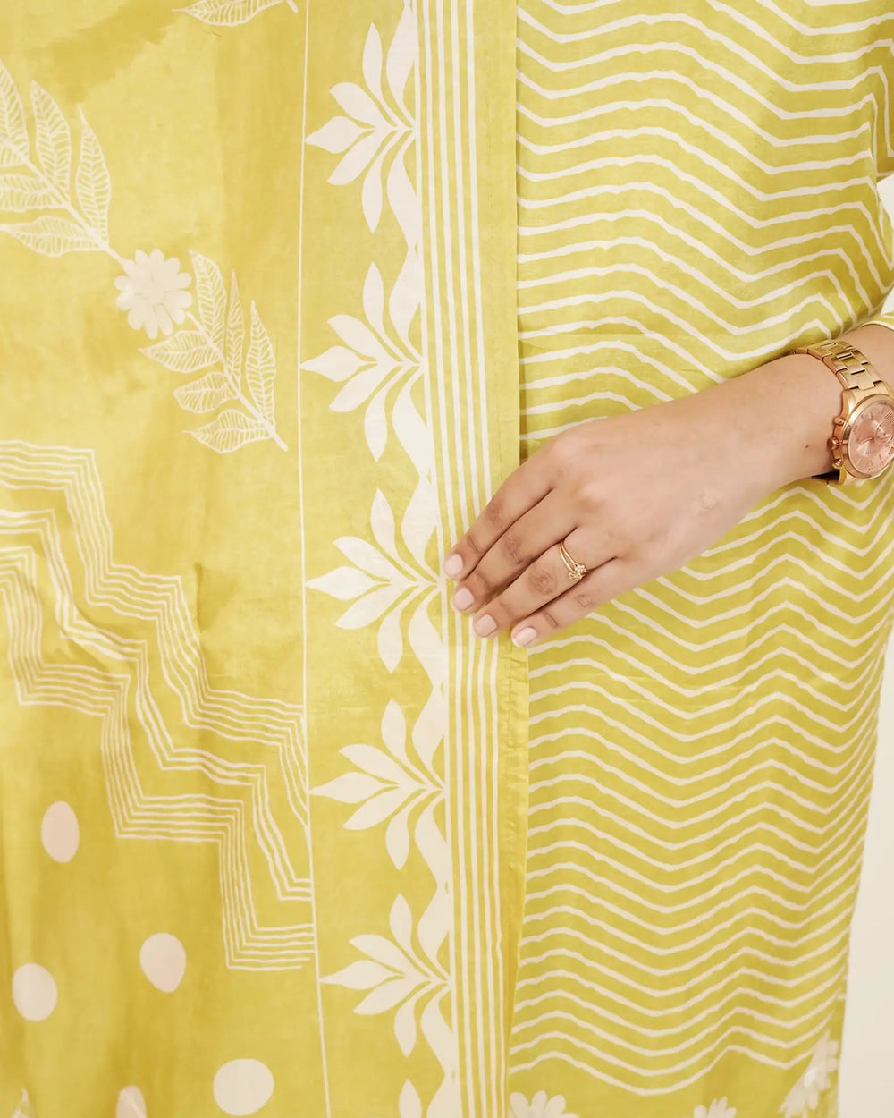 Pear green muslin silk salwar suit with horizontal zigzag stripes, floral motifs, and subtle beadwork. Styled with a straight-fit shantoon bottom and a floral printed muslin silk dupatta finished with thread tassels.